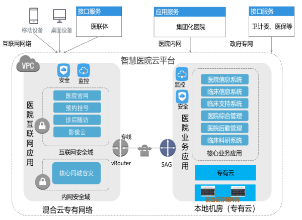 依托當地的IDC資源,通過建設公共云和本地專有云組成混合云模式,在保障業務安全、信息安全的前提下,支撐互聯網醫療應用的拓展及數據共享,構建區域智慧醫療混合云平臺。